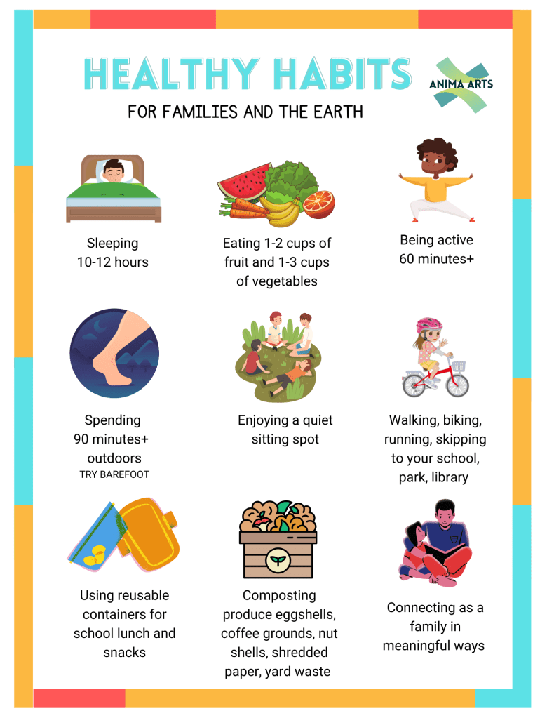Click HERE for printable version of “Healthy Habits for Families and the Earth”. This version also includes information for parents and caregivers and links to resources and data.