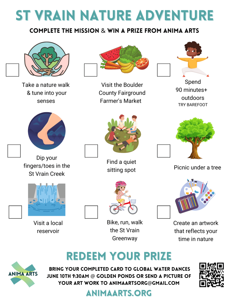 The St Vrain Nature Adventure is part of Stories from the St Vrain, an arts, advocacy, and community health project celebrating the human & environmental stories of the St Vrain Creek. The project purpose is to strengthen the connection between the St Vrain Creek and Longmont community, through innovative art, science, and education partnerships focused on addressing water related issues such as scarcity, adaptation and resilience, and to provoke community action.