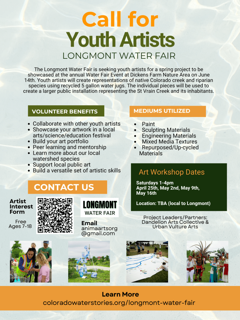 Anima Arts and the Longmont Water Fair are seeking youth artists for a spring project to be showcased at the 2026 Water Fair. Over four Saturday afternoons youth artists will create representations of native Colorado creek and riparian species using recycled 5 gallon water jugs.